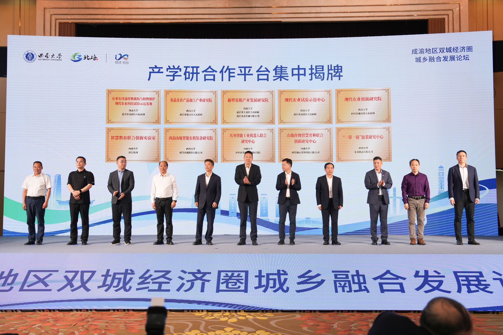 论坛成果丰硕、务实高效。现场举行了集中签约与揭牌仪式,西南大学与北碚区、荣昌区、江津区、巴南区、大足区、垫江县、秀山县、南充市、雅安市、绵竹市等10个市(区县)政府,以及科大讯飞、泸州老窖、建设银行重庆市分行、西南证券、康师傅饮品、大益茶业、中盐西南盐业、重庆农投集团、重庆江北国际机场、重庆鑫源农机等10家龙头企业签署合作协议。同时,西南大学与地方政府及龙头企业共建的现代农业科技试验示范基地、现代农业研究院、食品及农产品加工产业研究院、智慧教育联合创新实验室、山地智能农机装备研究院、具身智能工业机器人联合研究中心等10个涵盖现代农业、智慧装备、食品加工、智慧育种等关键领域的产学研合作平台正式揭牌。系列务实举措标志着校地、校企合作迈入系统化、平台化、长效化新阶段。