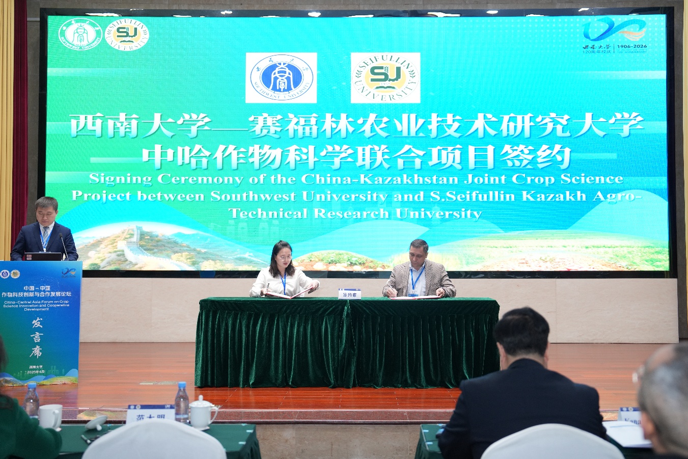 4月17日,由西南大学与哈萨克斯坦赛福林农业技术研究大学联合主办的中国-中亚作物科技创新与合作发展论坛在学校举行。重庆市农业农村委员会、西南大学相关领导出席活动,来自中亚及“一带一路”沿线国家、国际科研机构、国内高校与科研院所的100余位作物科学领域专家学者参加。本次论坛以“绿色丝路,丰盈未来”为主题,搭建中外专家学者、科研机构与产业界学术交流与技术对接平台。